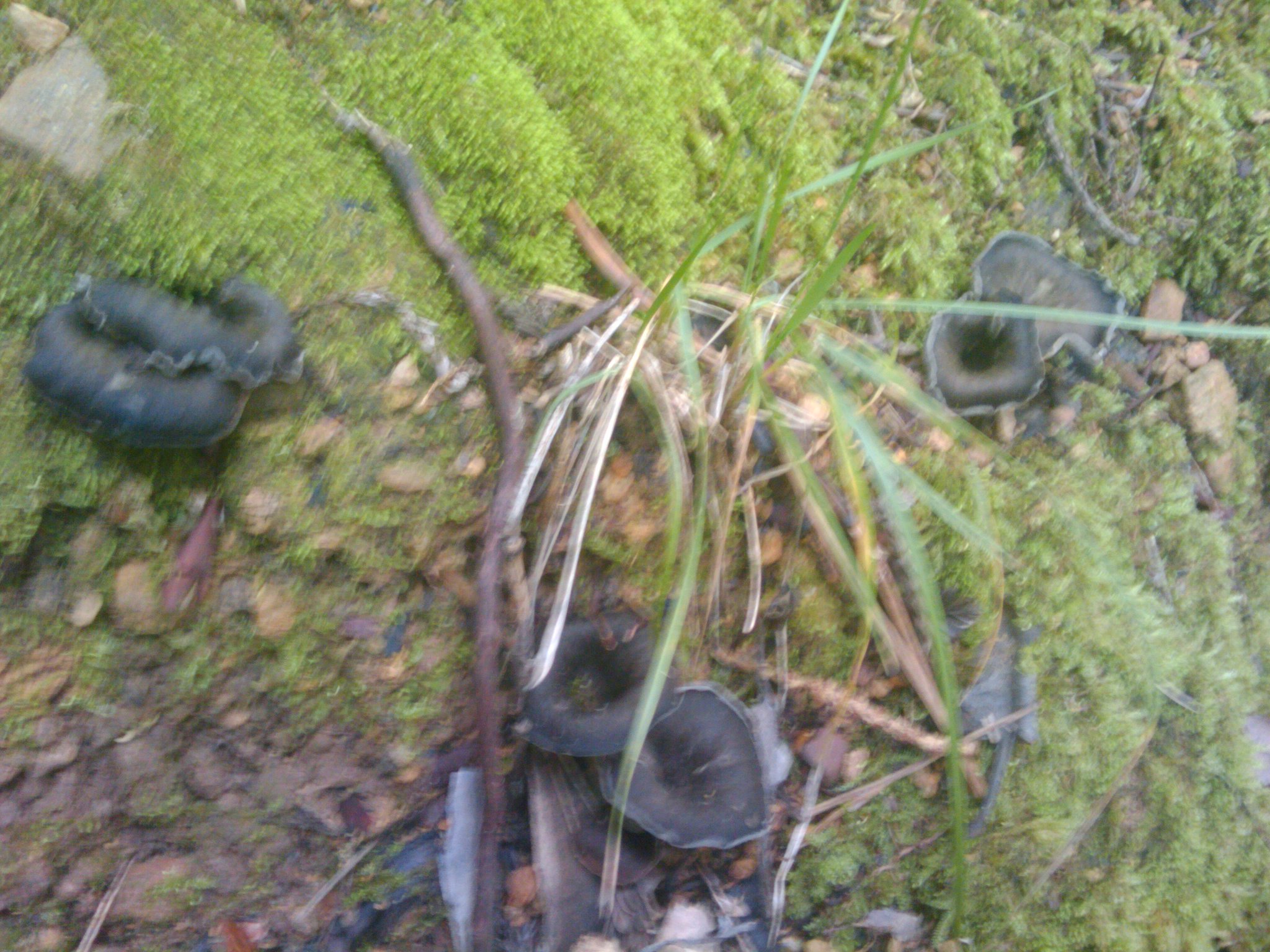Unfortunately, I usually don’t have my real camera with me either. So the photos are less than perfect but these lovely little fungi were just popping through the green moss (is that moss?) that was growing on the hillside. I don’t know what it is but I never find trumpets on flat land, it’s always somewhere that I have to perch precariously on a hillside and try not to slide all the way down it!
