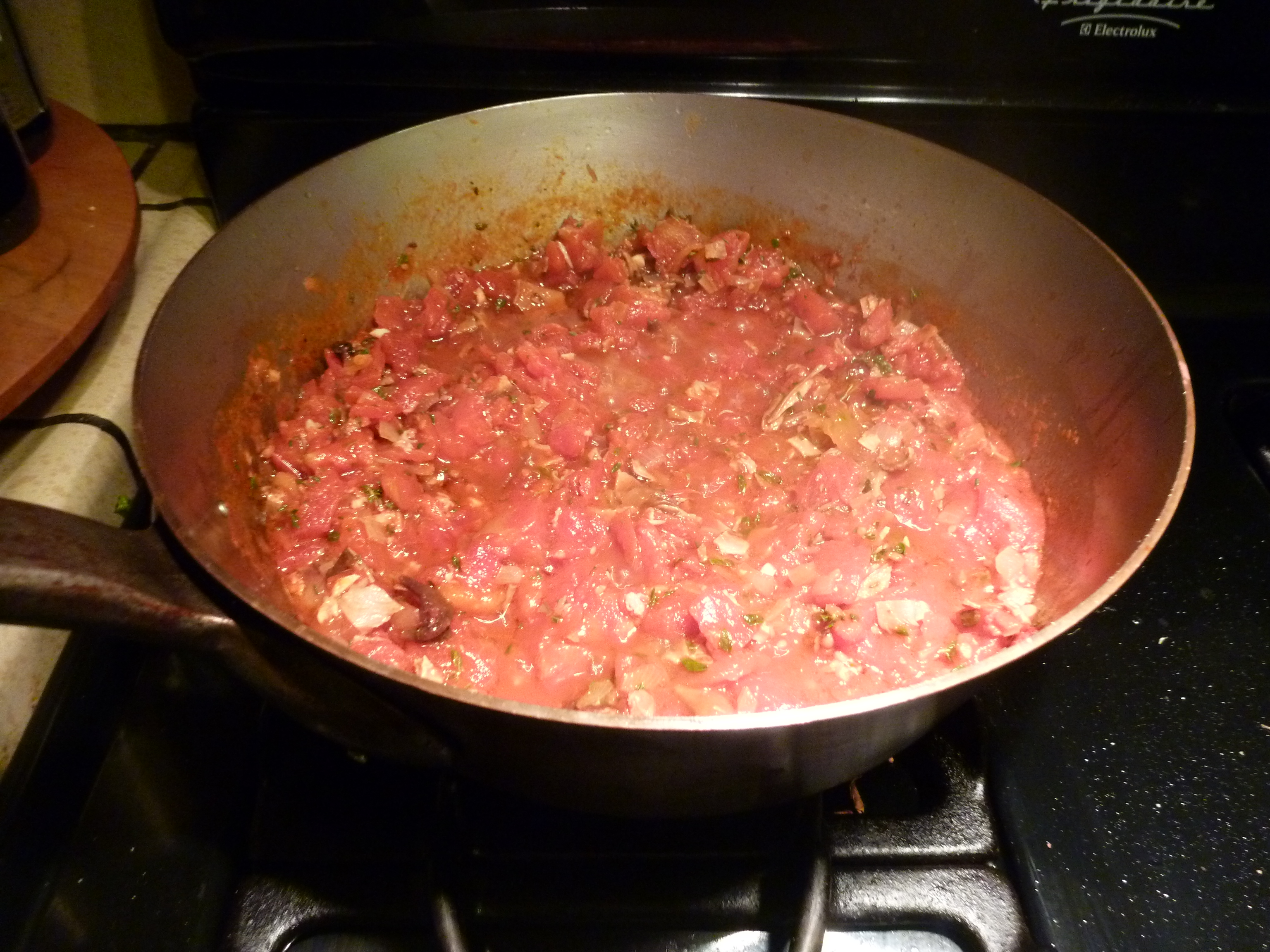 Chop up the porcinis once they’re soft and add them to the sauce. Let that reduce for, oh, awhile. You want to cook off most of the water bit of the tomatoes so you have a good thick sauce. When almost all of the liquid is cooked off add a huge handful of minced herbs. I use thyme and marjoram.