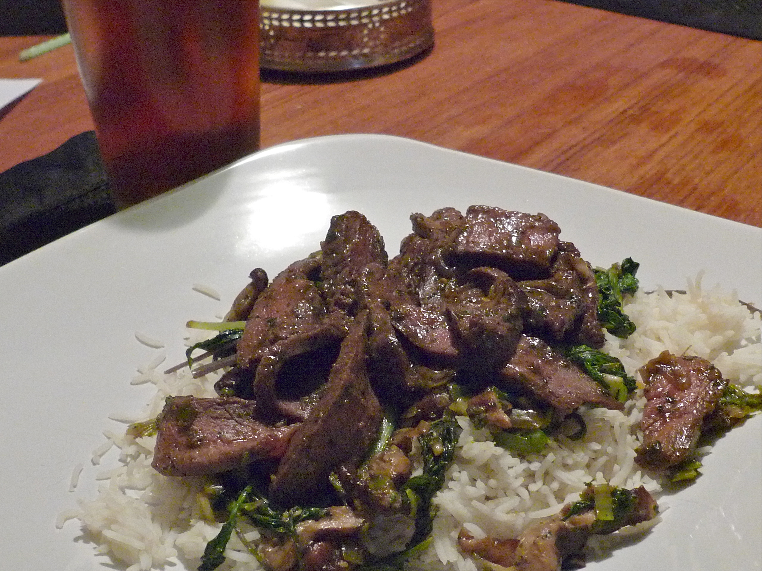 - To serve, put a mound of rice, a scoop of greens/mushrooms and top with the beef.
