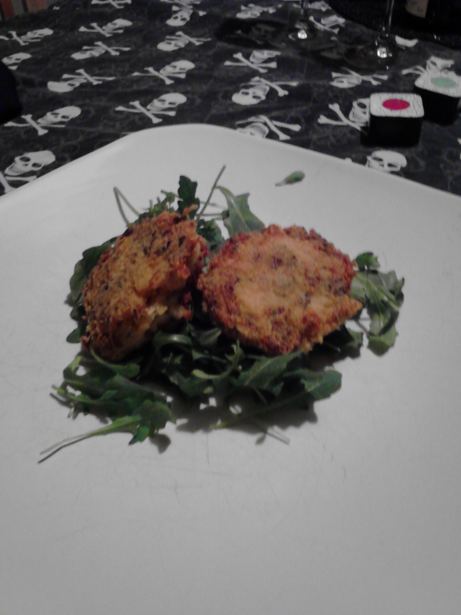This is a variation on crab cakes I’ve done in the past. This time I only sauteed up shallots and garlic and threw a little chopped arugula in at the last few seconds. Added salt, pepper and chopped thyme. The hardest part of the crab cakes is getting the crab meat out of the shells, the rest is a cinch! The key is to not touch the cakes in the pan until the are crispy brown on the bottom or else they’ll completely fall apart. Put the patties in and walk away. I also used semolina flour to dredge them in instead of white flour. I like the texture better.