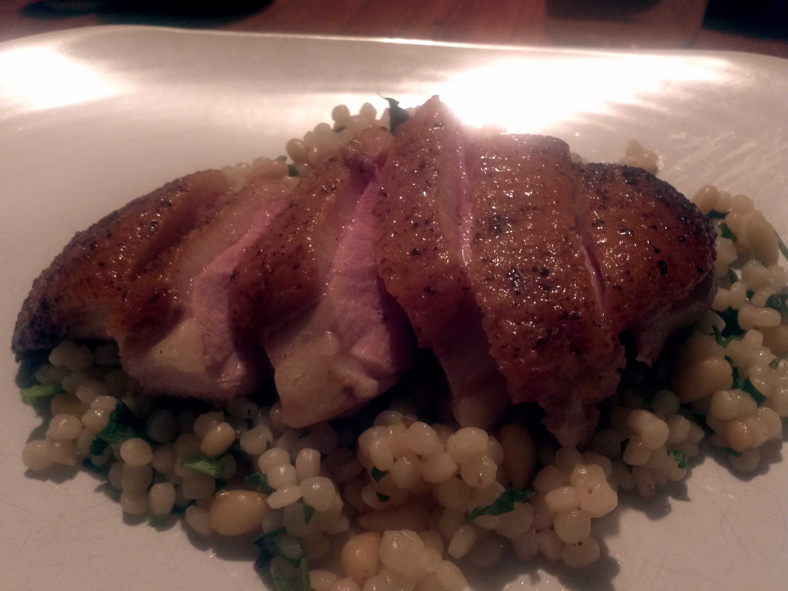I cut the wings and legs off the duck and put them in the freezer for another time. I cut the breast off, leaving the bones attached. I seared the breasts skin-side down in a hot pan, on high heat, for about 6 minutes. I drained off the fat, turned the breasts over and put it in a 400° oven for 9 minutes. Took it out, let it rest for 8 minutes. Carved it off the bone, sliced it and served it over israeli couscous with pine nuts and parsley.
