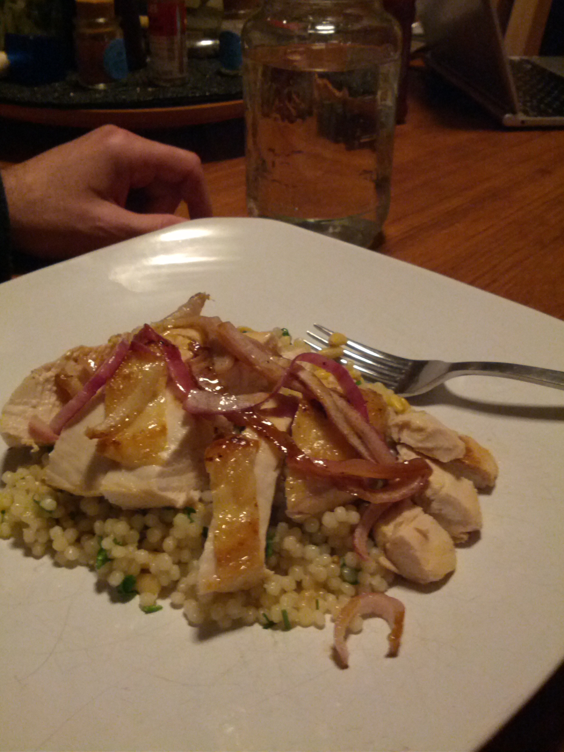 Meanwhile, put 2 cups of israeli couscous in a pot with 2 cups chicken stock and ½ a cup of the marinade liquid. Bring to a boil then simmer for about 10 minutes until tender. Stir in toasted pine nuts and chopped parsley.