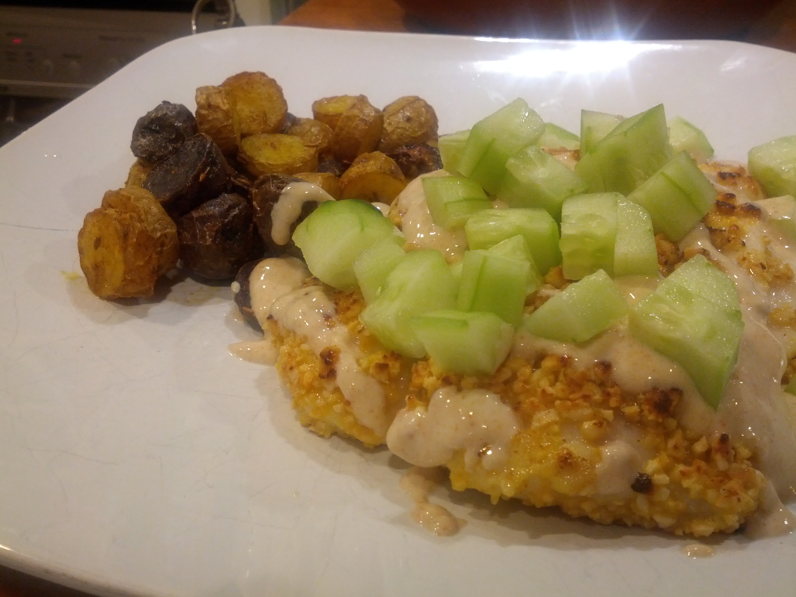 For the fish, I drenched the fillets in egg yolk then dredged them in curry cashews. I don’t know if your store’s bulk section carries these but they are like crack. Curry cashews. Best snack ever. Simple. Awesome. I put a cup or 2 of them in the food processor and made curry cashew crumbs. After crusting the fish with the cashews I put it in a cast iron pan over medium-high heat for about 3 minutes per side or so. Long enough to cook the fish through but not burn the cashews. If the cashews start cooking too fast, lower the heat!