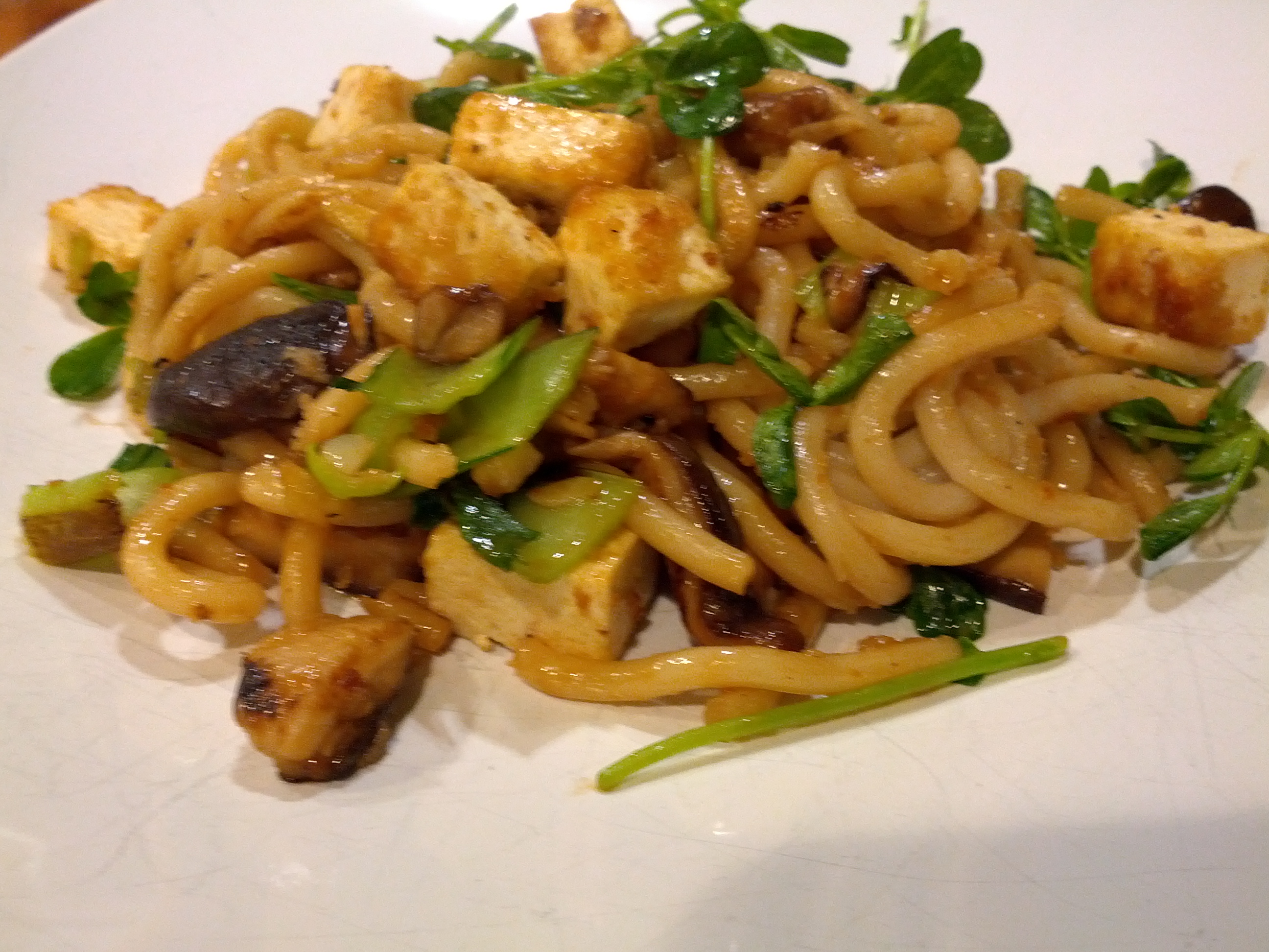 I also happened to have a couple of packages of fresh udon in the fridge. I’m not a big fan of udon soup, I like skinnier noodles in broth. This was a great way to use up those noodles.