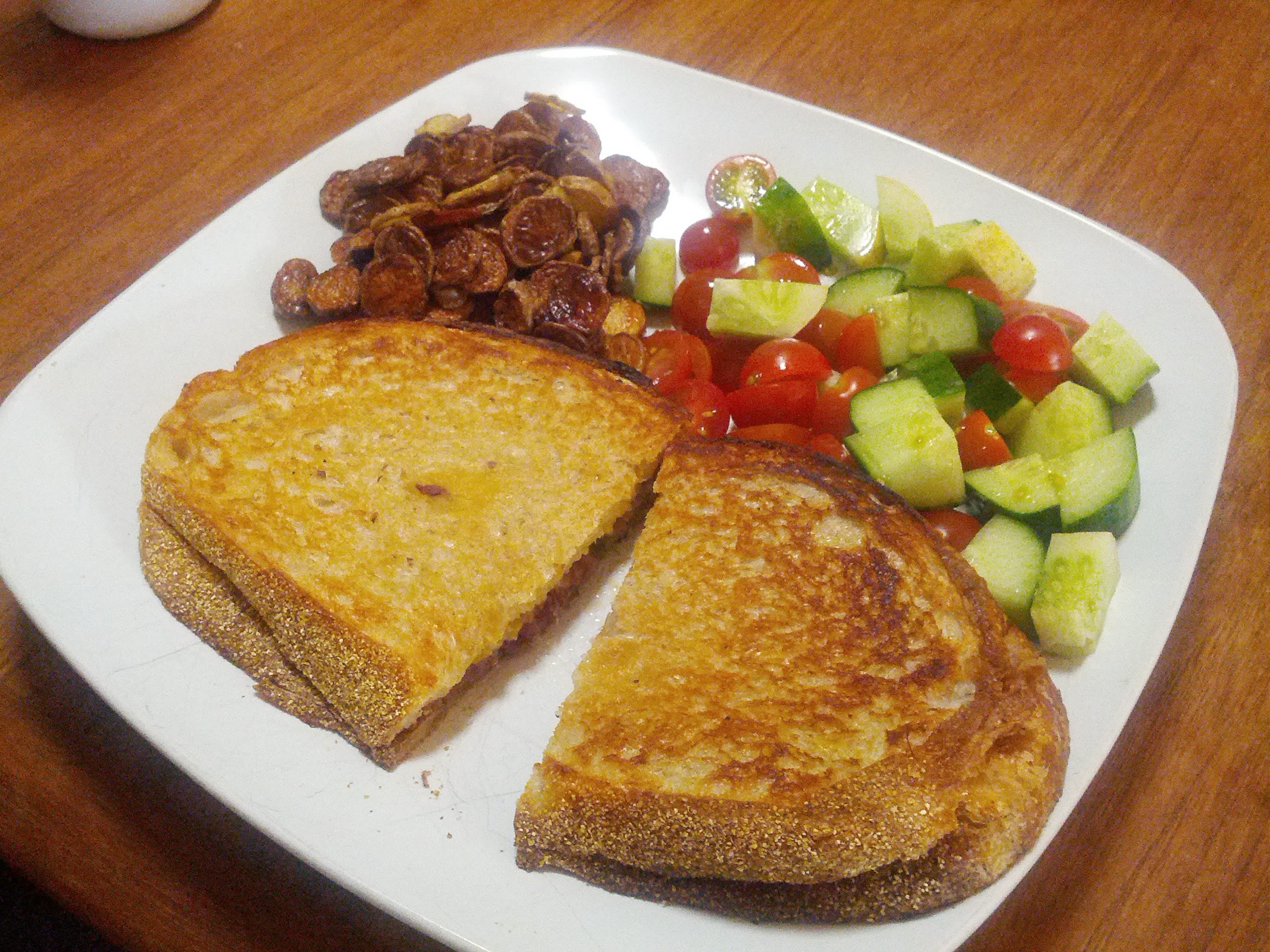 I had some fingerling potatoes to get rid of too so I thinly sliced them, tossed them with olive oil and put them in the oven at 400° for way too long until they were crispy and nearly burnt. We like crispy potatoes in this house. The other side dish was simply cucumbers and tomatoes from the farmers market with just a little salt.