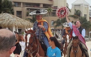 The much anticipated entry of Jose Andres to his Friday morning demo was not disappointing. Long known at the cookout as the Three Amigos, they arrived in character: Jose, Eric and Tony on horseback with sombreros. They are a hoot. They pulled it off quite well! Jose clambered down and started right into making Pisco Punch (excellent!), gazpacho (hubby said it was great, it had bell peppers), and Fideuà which was heavenly. There was all the drama of a typical Jose demo: lots of jokes, lots of info, this time a spilled drink, and unzipped fly….hilarious!!