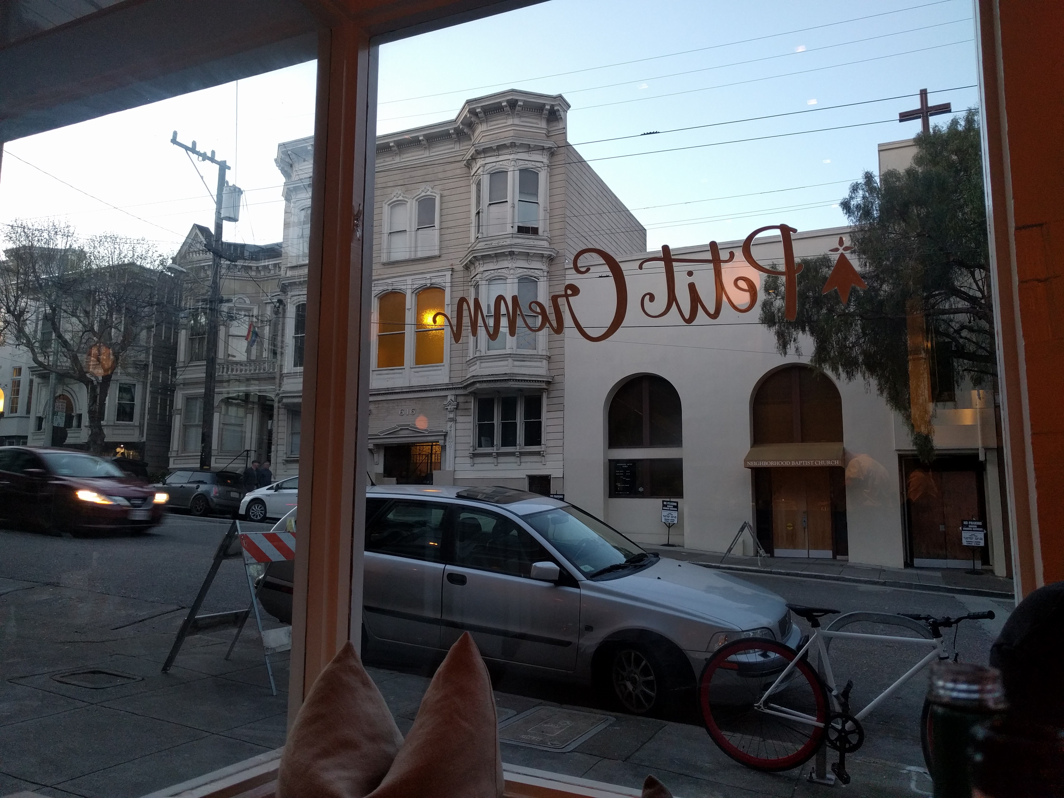 Good thing it’s a casual place because my husband, who’d been in SF for a conference all week, sent his dress shirt and pants to the hotel laundry to be pressed (there was a coupon in the room for a free pressing…why not, right?). Five o’clock rolls around and we still have no shirt back. Call to the front desk, they’ll look into it, blah blah. 5:15 we get a call–a very nervous woman explains that the shirt had a bit of a mishap. It got bleached…ruined really. We can work out the details later but “feel free to get anything from the hotel gift shop.” We tried, it’s all pastel, plaid, Republican golfer wear which we definitely do not fit the bill of so…Well, we don’t need to dress up for Petit Crenn so off we went in a t-shirt. We’ll get back to the laundry in a bit.