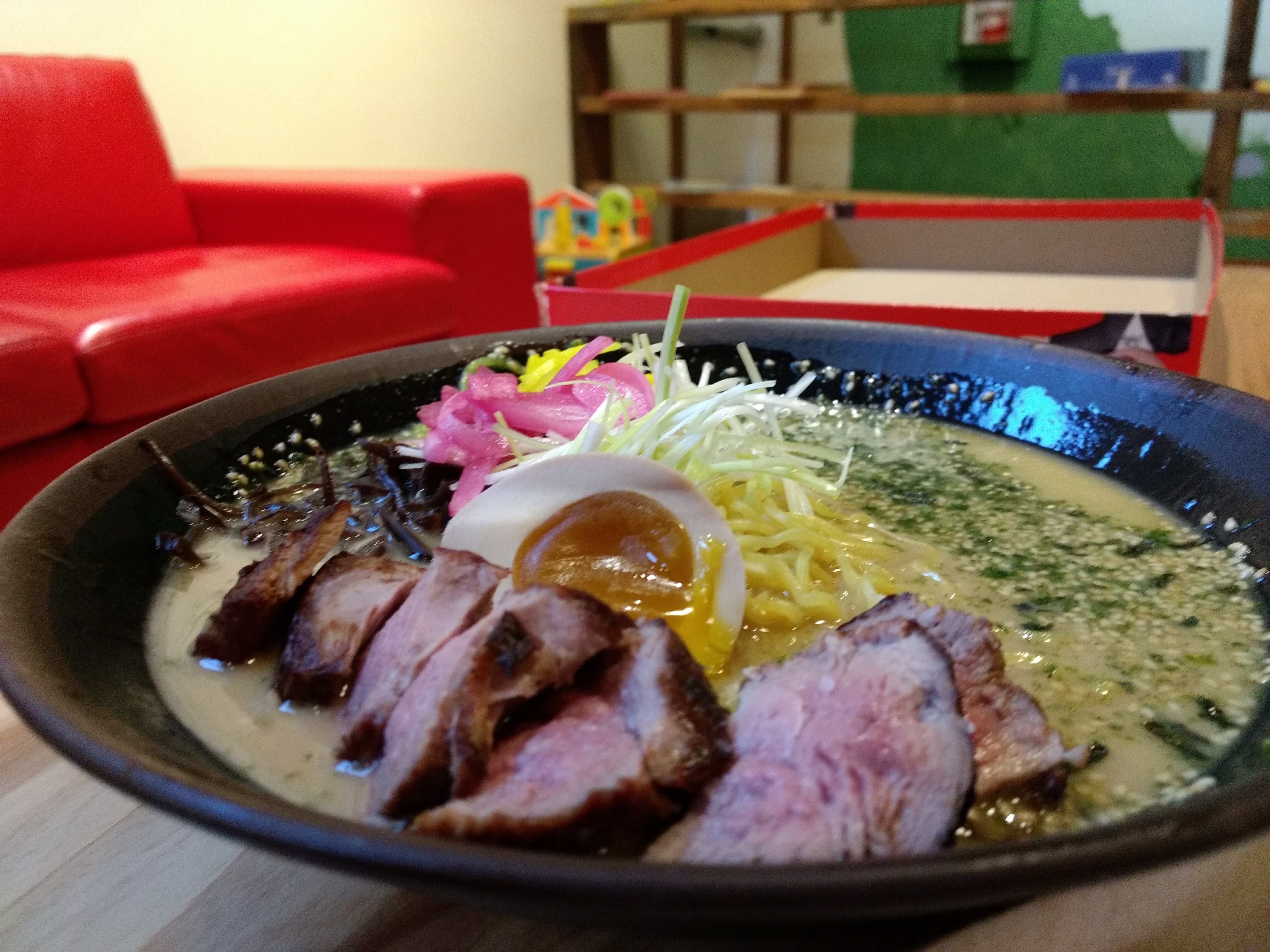 The space is welcoming and fun. You order at the counter. The menu is incredible. I wished there had been more than two of us so we could order one of everything. Alas, we had to limit ourselves and we got the Duck Gyoza, Housemade Pickles and Tonkotsu Ramen with added Duck Confit. We grabbed our drinks, I got a pint of Brown Ale and my son got Yuzu-Lemon-Basil soda, and headed to the big red couches, grabbed Monopoly and settled in.