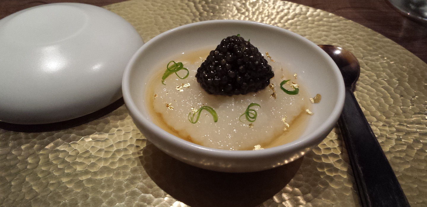 Seared the other half of the otoro very briefly and served with little dots of yuzu kosho.